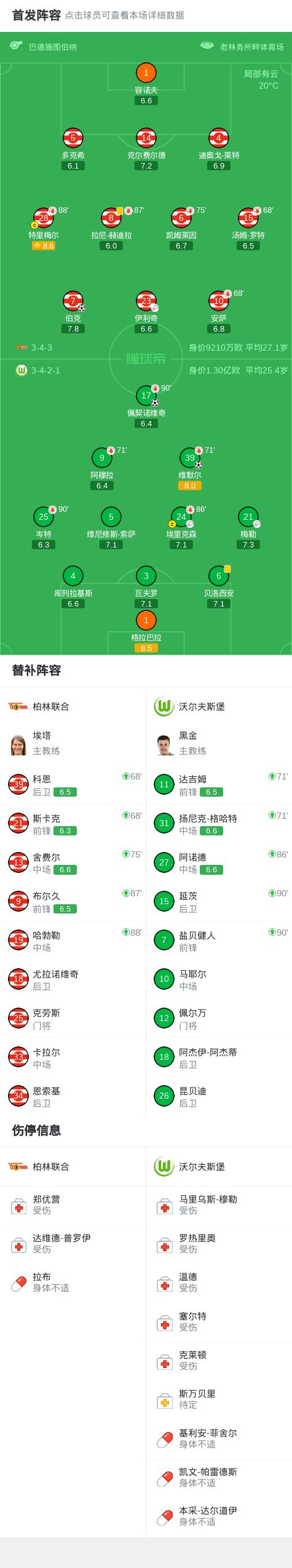 北京时间4月18日德国足球顶级联赛 联赛 第30轮,柏林联合主场对阵沃尔夫斯堡。柏林联合伯克破门。沃尔夫斯堡维默尔破门,佩契诺维奇破门。最终比分柏林联合 1-2 沃尔夫斯堡。精彩瞬间第11分钟,沃尔夫斯堡球员梅勒助攻维默尔打入一球。第46分钟,沃尔夫斯堡球员埃里克森助攻佩契诺维奇打入一球。第85分钟,柏林联合球员伊利奇助攻伯克打入一球。球队阵容技术统计